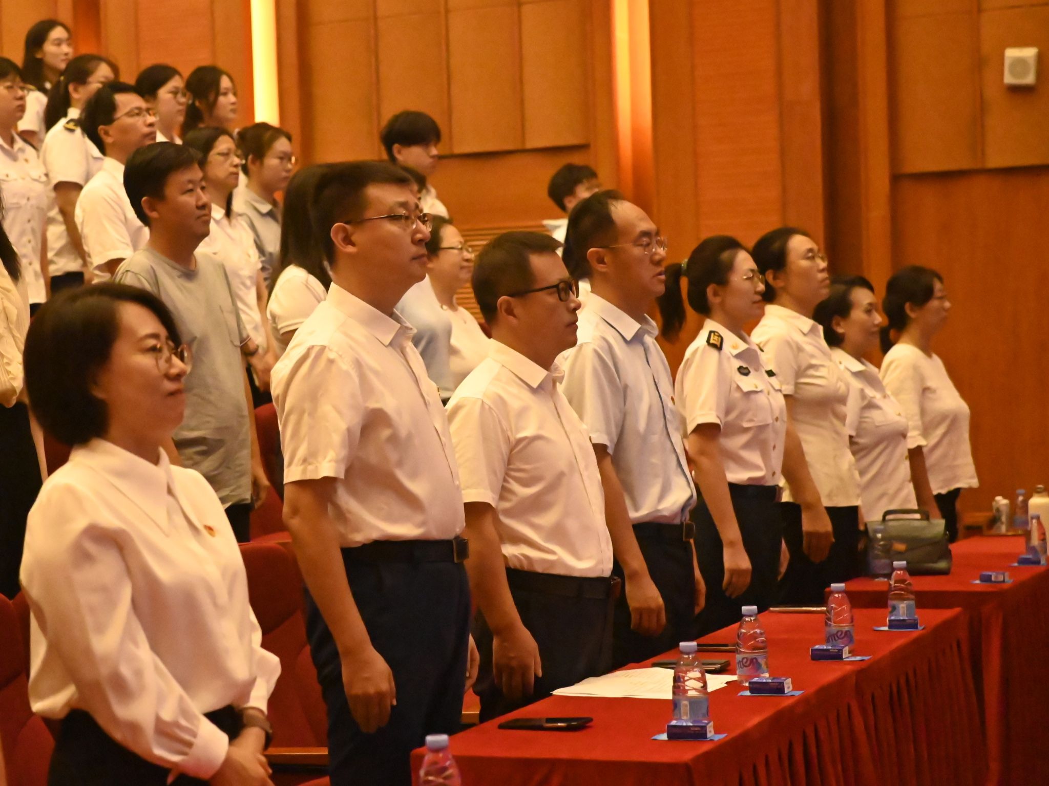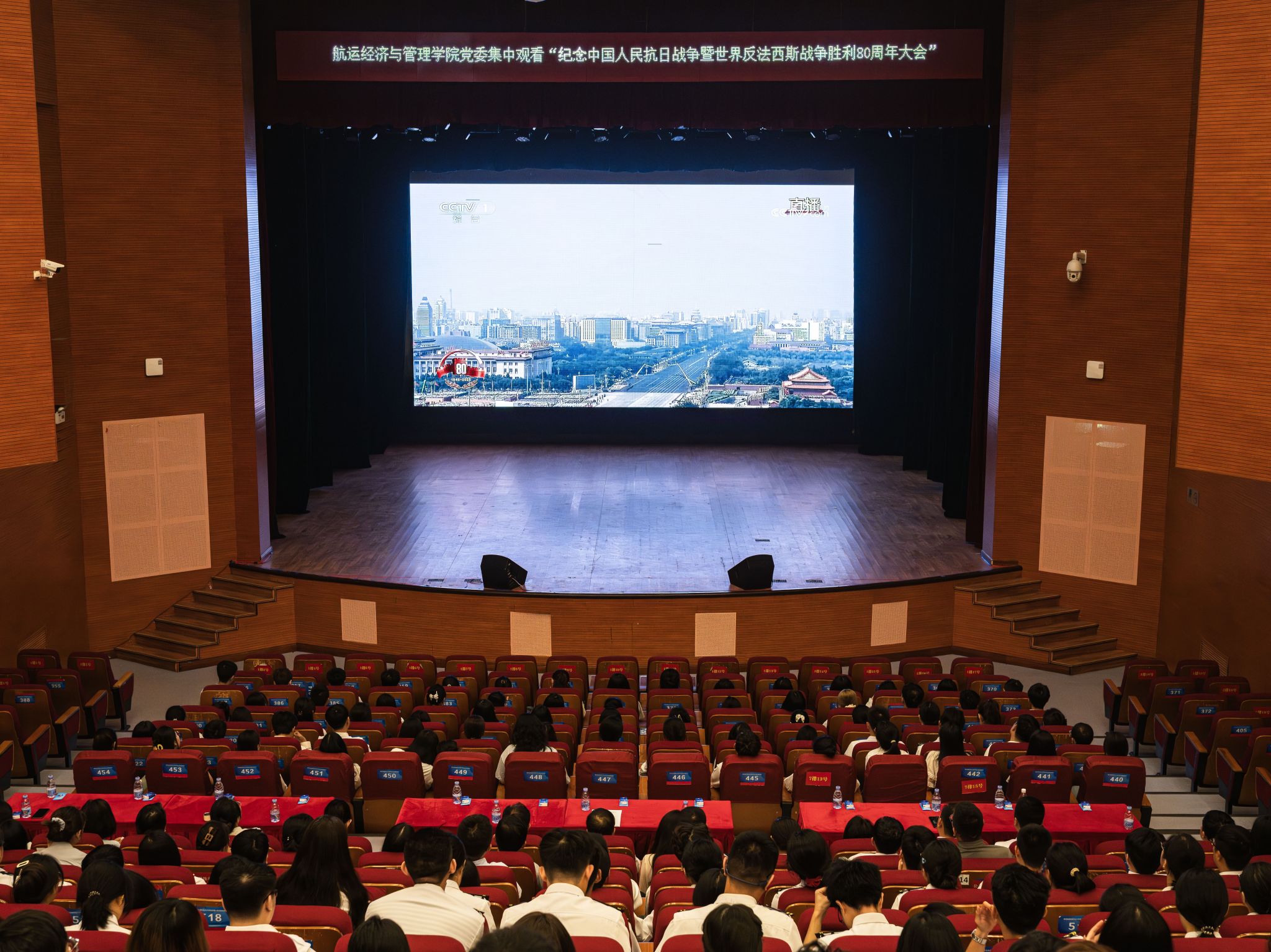 9月3日上午8:50,活动准时开始。本次活动设主会场和分会场,主会场为新大学生活动中心104报告厅,学院全体领导班子、师生党员代表、入党积极分子代表等在此参会;分会场为管理楼B座4楼会议室、英华一公寓108会议室,其他师生就近选择参会,2025级本科生按照学校统一安排观看大会。