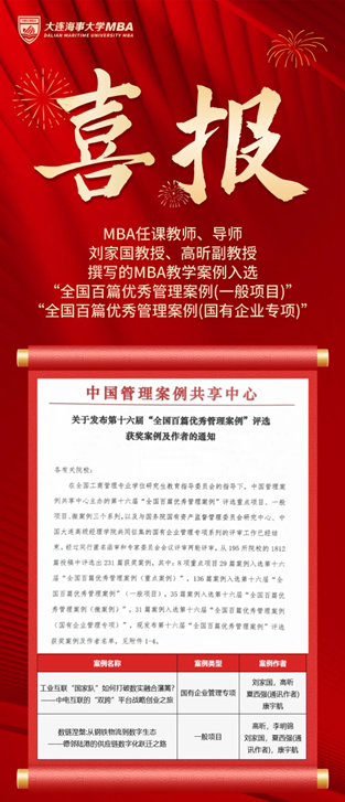 第十六届“全国百篇优秀管理案例”评选结果揭晓,MBA任课教师、导师刘家国教授及MBA导师高昕副教等授撰写的MBA教学案例,从全国195所院校的1812篇参评作品中脱颖而出,成功入选“第十六届全国百篇优秀管理案例(国有企业专项)” 及 “第十六届全国百篇优秀管理案例(一般项目)”。这一成果不仅为海大MBA教育带来了生动鲜活的管理实践案例,而且深度挖掘国有企业管理实践经验,为推动我国管理教育的高质量发展提供了坚实的支撑。