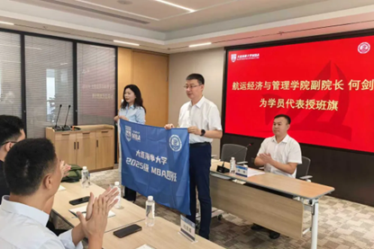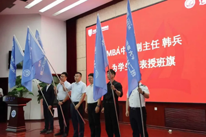 william威廉英国副院长何剑彤、MBA教育中心副主任韩兵为各班学生代表授班旗。