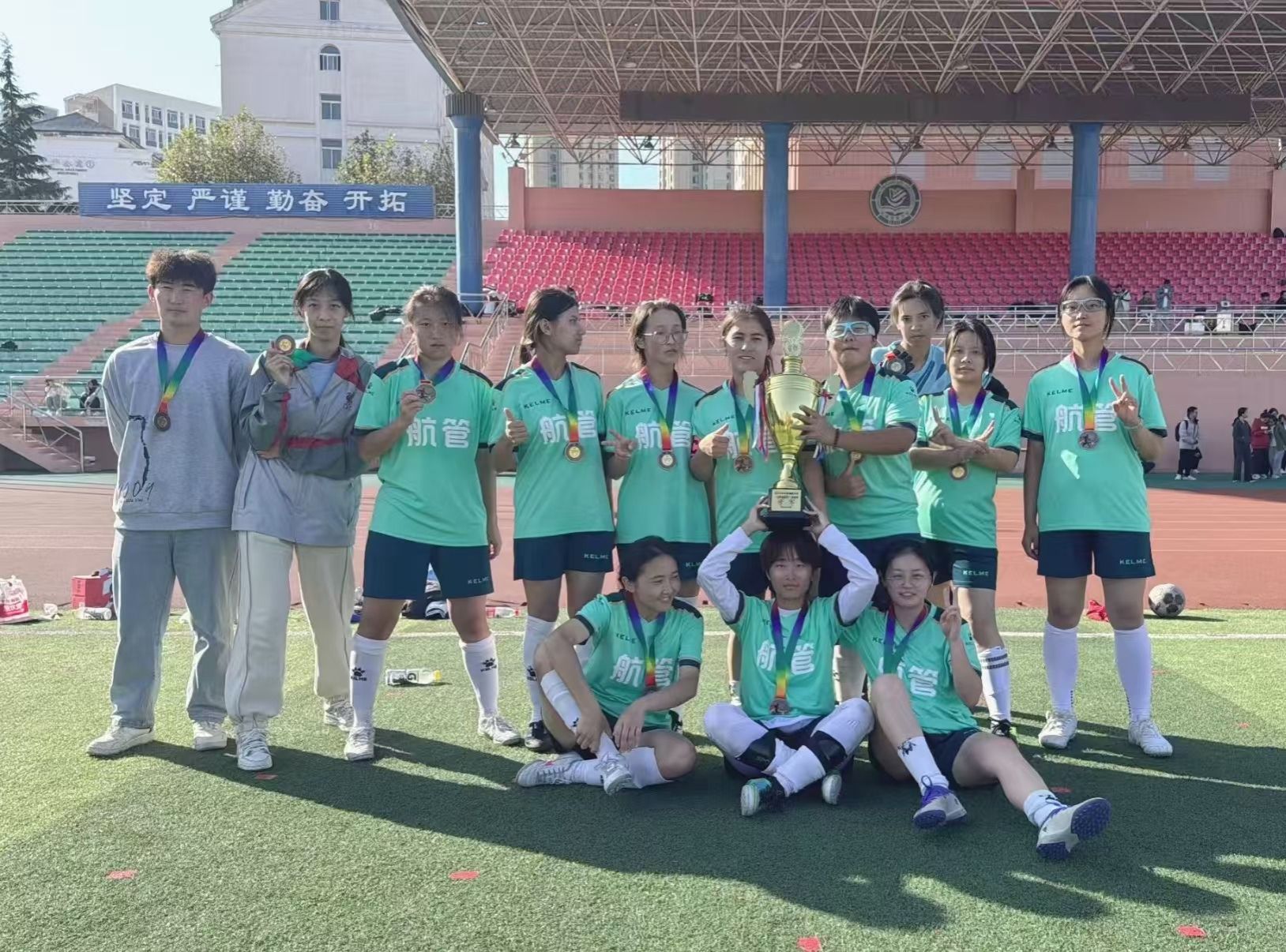 我院男子、女子足球队赛前积极训练,认真备战。我院女子足球队披荆斩棘,在小组赛中迎战法学院、环境科学与工程学院,成功出线,在半决赛点球憾负外国语学院,最终获得季军。