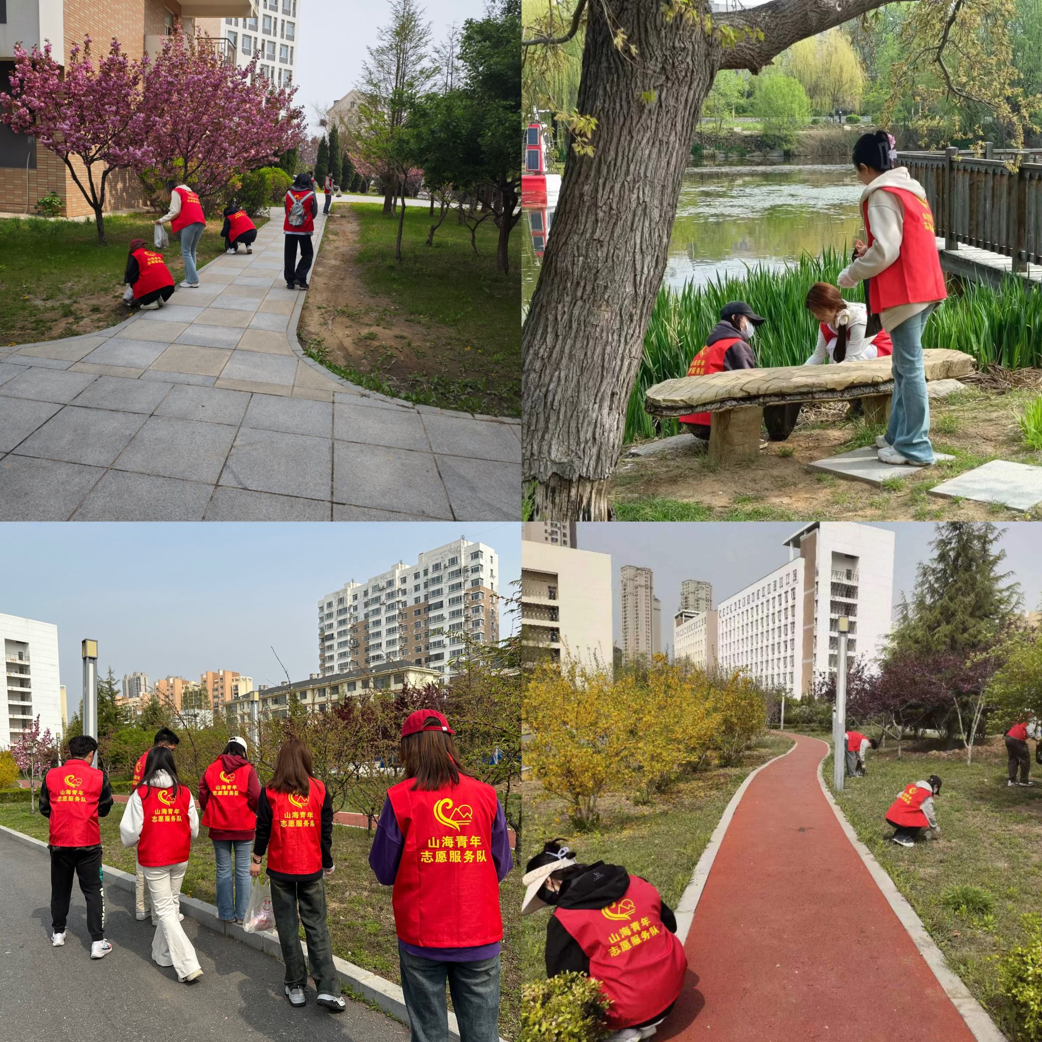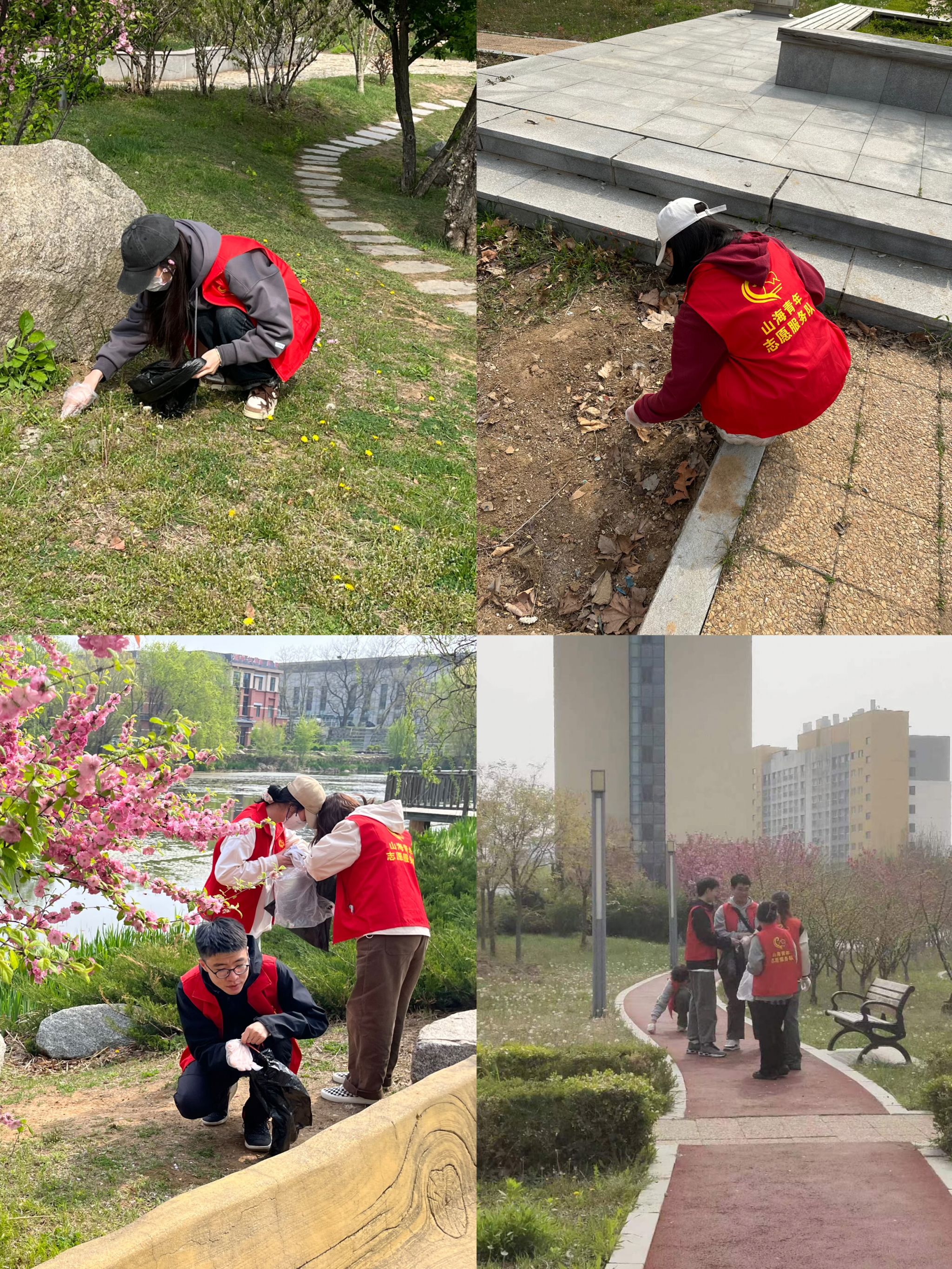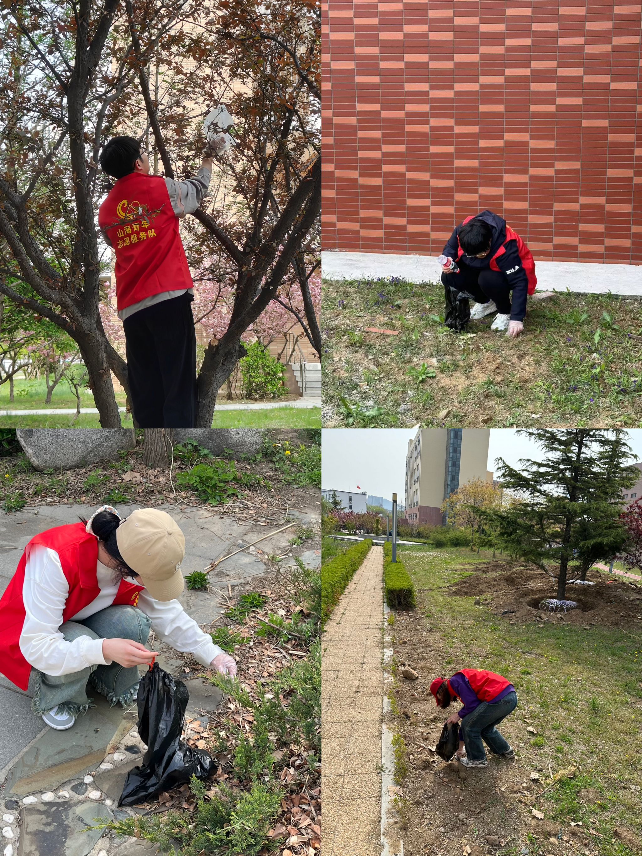 2024年4月28日上午9点,参与活动的志愿者同学们在英华四公寓楼前集合,志愿者们统一身着山海青年志愿服务队的红色马甲,精神焕发,在校园内成为了一道红色靓丽的风景。随后,党支部进行任务分配,志愿者们纷纷行动起来,对校园内的各类垃圾进行了细致的捡拾。一、二、三班的志愿者们负责新大活后身花园及其周边区域的环境清洁任务,四、五班的志愿者们负责英华一和英华二公寓周边的环境清洁任务,五、六、七班的志愿者们负责心海湖周边区域的环境清洁任务。整个活动现场充满积极的氛围和志愿者们忙碌的身影。
