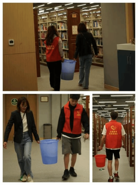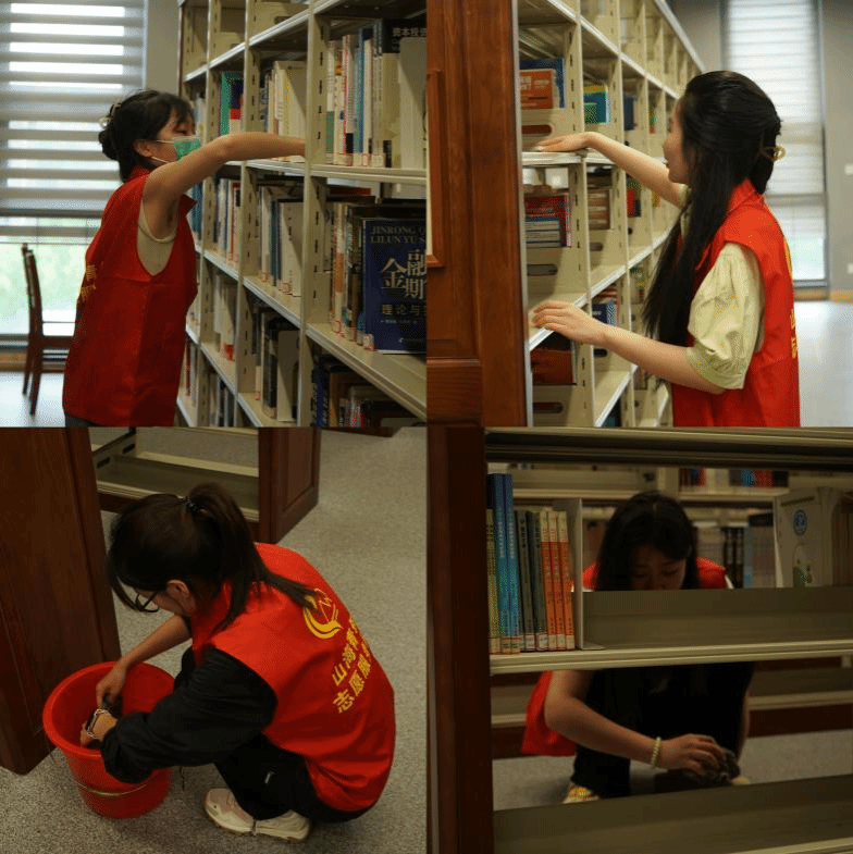 活动伊始,志愿者们准时集合,大家身着统一的志愿者服装,携带抹布、水桶等清洁工具,精神饱满地投入到工作中。在负责人进行简要分工后,大家迅速分散至图书馆三楼的各个书架,对书架的每一个角落进行了细致入微的清扫。