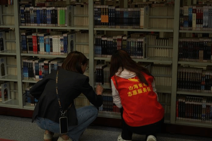 书架间,志愿者们细心地使用干抹布擦去书籍封面和书架缝隙中的灰尘。