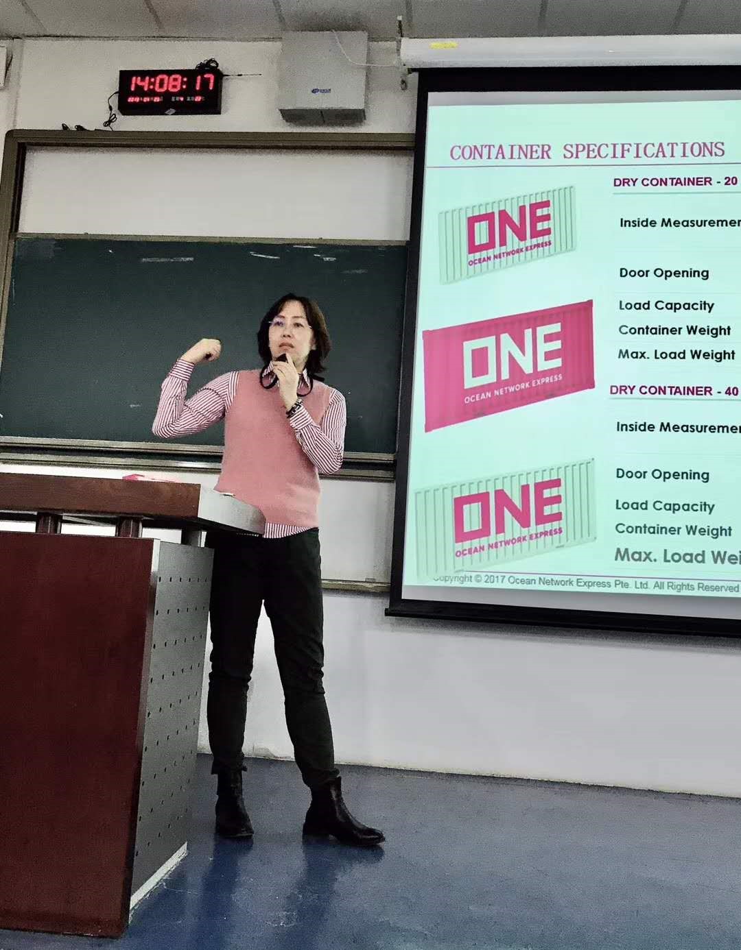 姜李心总经理 首先介绍了航运业风起云涌的30年,世界排名前20名的各大船公司的现状;然后介绍了ONE公司的企业组织结构、企业文化、项目流程、运营情况、公司愿景、遇到的挑战与机会;最后对学生入职及职场发展给予指导。