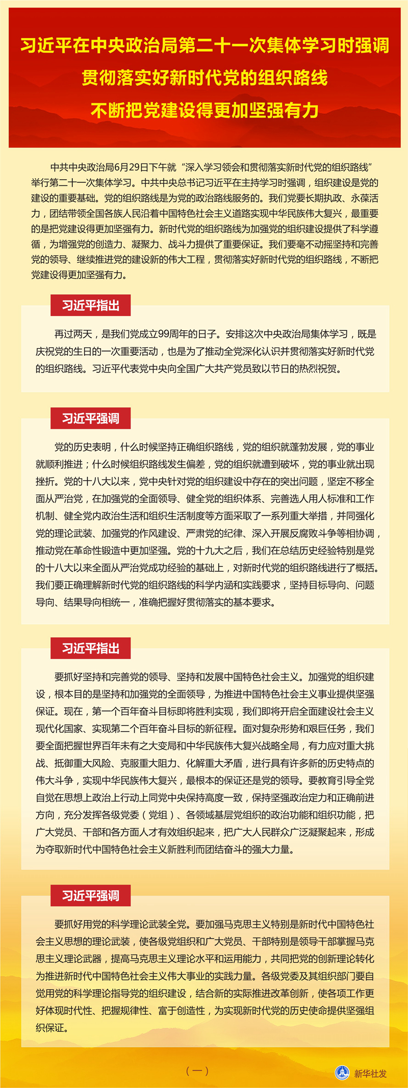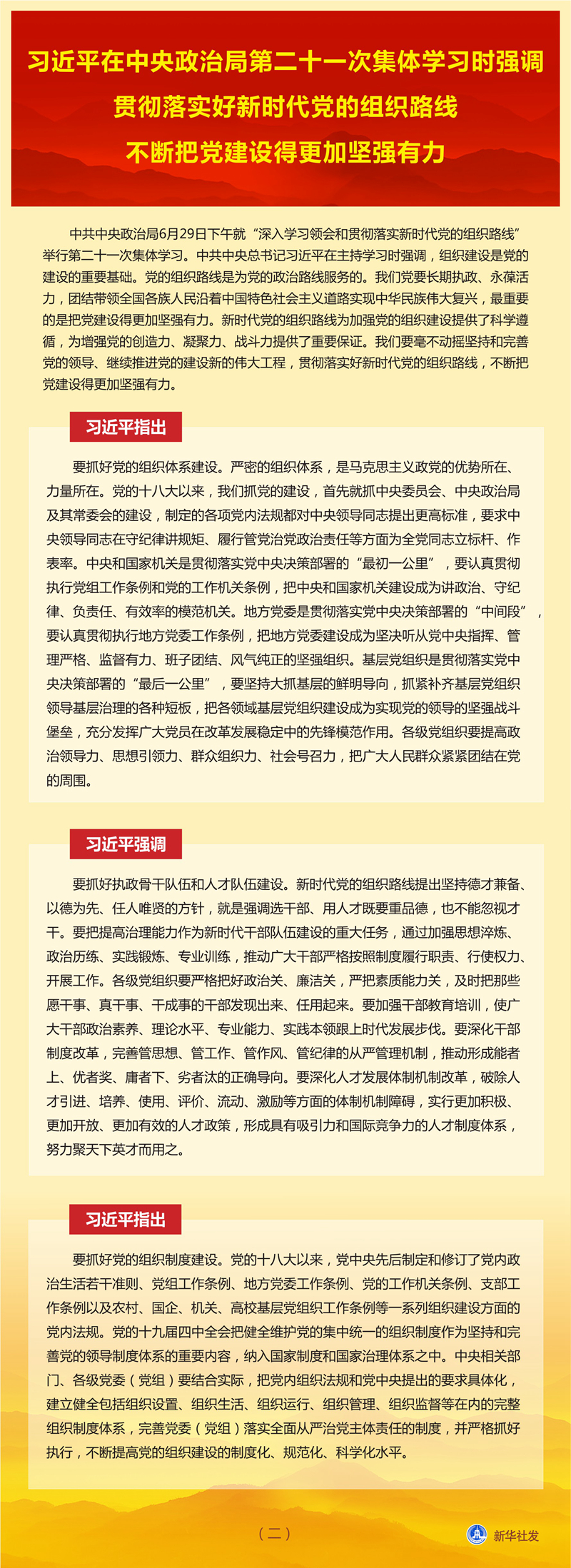 习近平在中央政治局第二十一次集体学习时强调 贯彻落实好新时代党的组织路线 不断把党建设得更加坚强有力